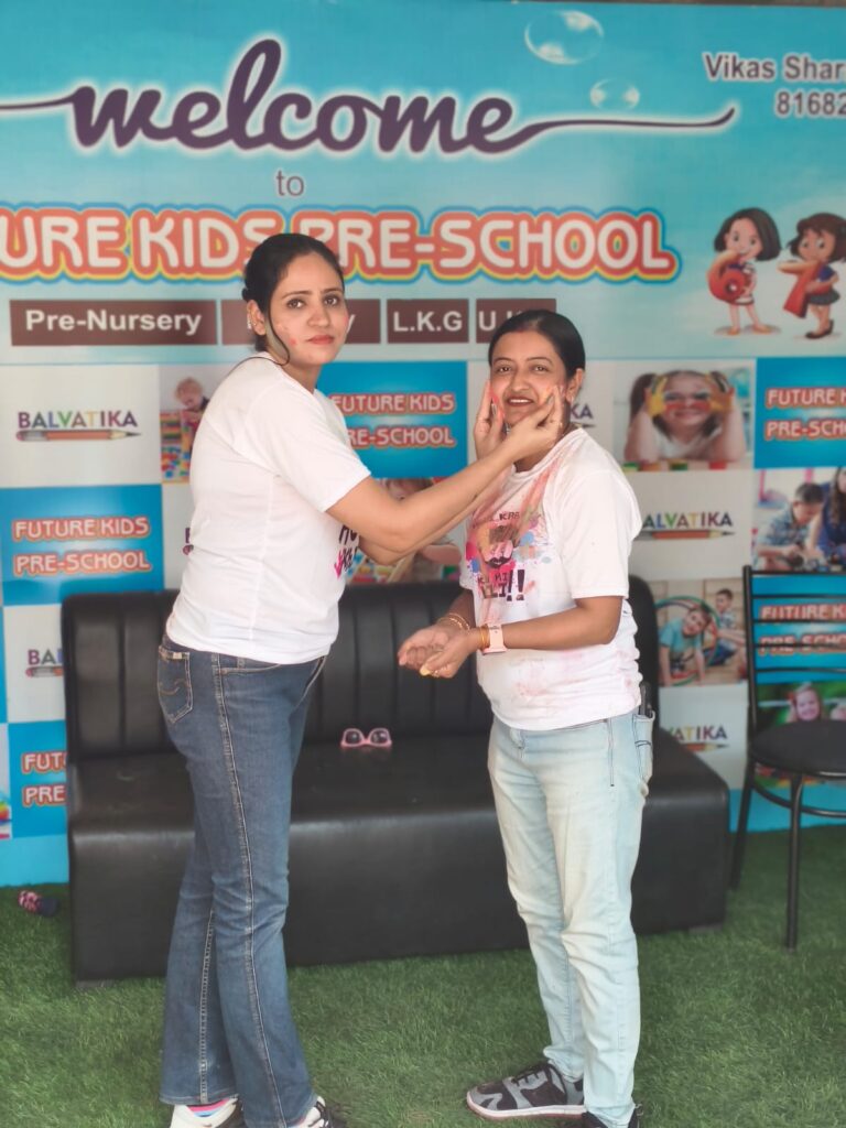 The joy of Holi at Future Kids Preschool wasn’t limited to our tiny tots-our teachers joined in with equal enthusiasm, making the celebration even more special! Dressed in vibrant ethnic wear and warm smiles, the teachers participated in every activity, from storytelling and dance sessions to the playful splash of eco-friendly colors. Their presence added an extra layer of excitement for the children, who look up to them as friends and role models. The teachers danced hand-in-hand with the little ones, tossed flower petals in the air, and even got playful color streaks on their cheeks-all while ensuring a safe and happy environment. Their active involvement turned the event into a celebration of togetherness, love, and laughter. It wasn’t just a festival; it was a shared experience of joy and bonding, creating unforgettable memories for both the students and the educators. At Future Kids, even the grown-ups love to play Holi like kids!